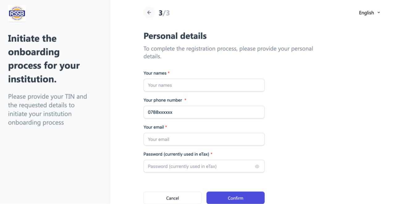 After confirming your company's details, you will need to provide your personal information, including your full name, email address, and phone number. Also, you'll be asked to enter the password you currently use to log in to RRA's eTax system. This step is necessary for secure authentication and to link your personal details to your employer account.
