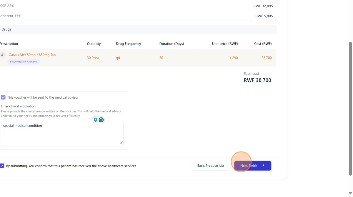 Click "Next: Finish," and wait for the medical advisor to review it.