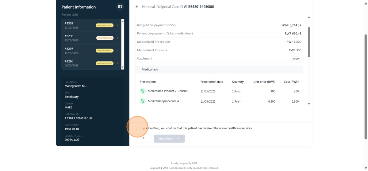 From here, you can see that RSSB will pay RWF 0, as the amount has already been covered under capitation, and the patient will only pay RWF 200.