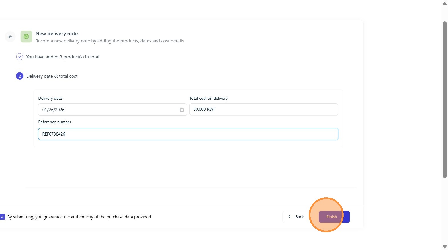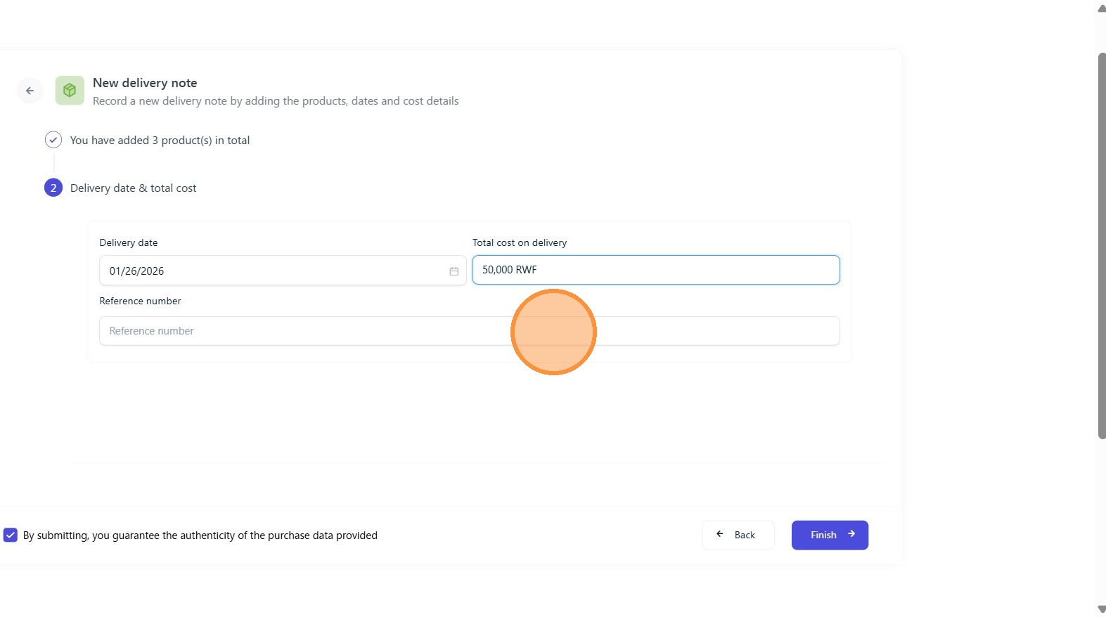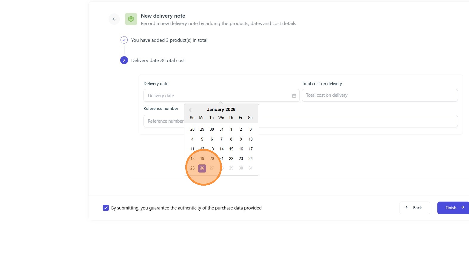Click "delivery date" field to enter the date on delivery note and "total cost" field to enter total cost on delivery note.